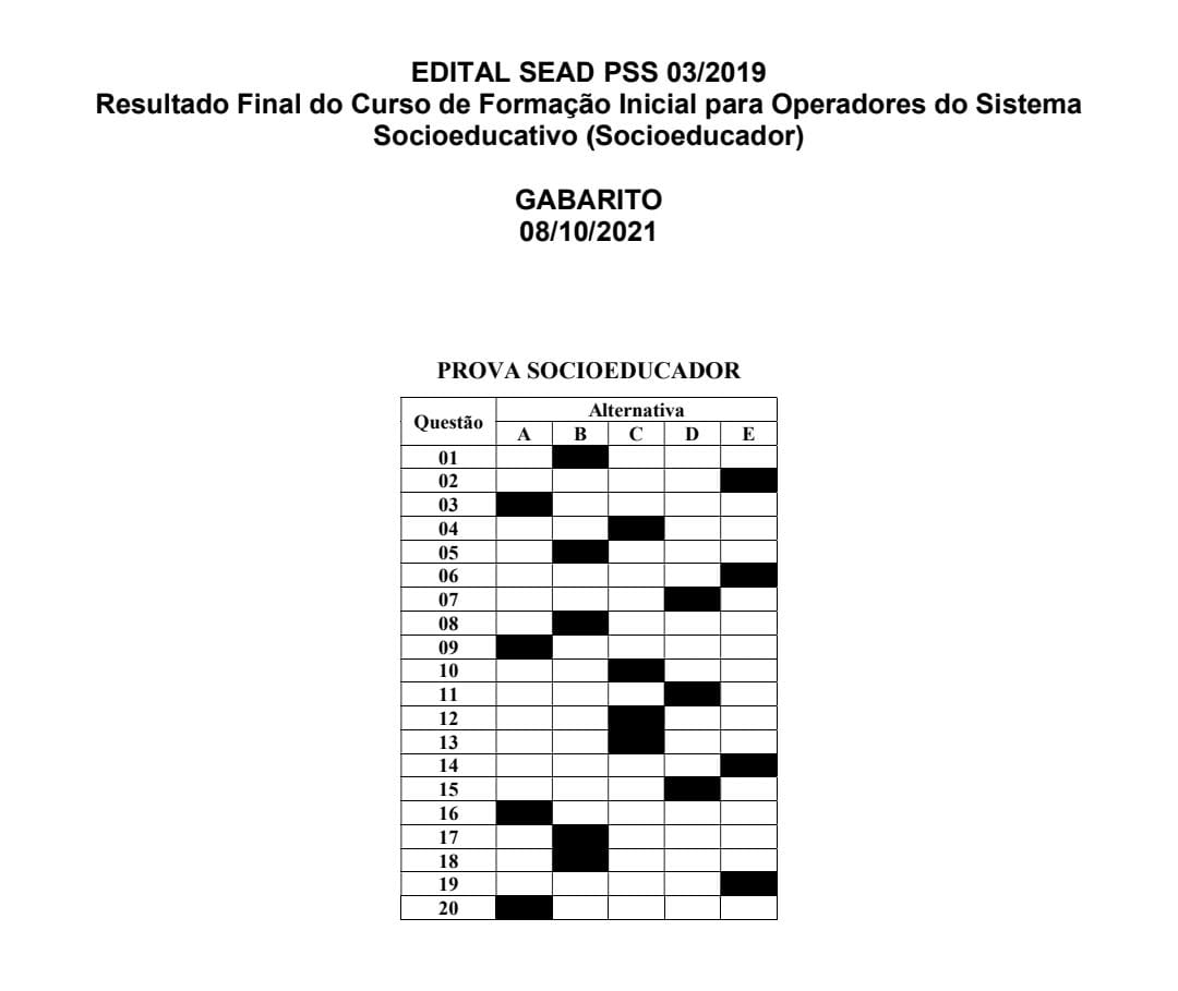 A prova foi composta por 20 questões objetivas, contendo todos os assuntos apresentados durante o curso, como a Socioeducação na perspectiva dos Direitos Humanos, Adolescência e Juventude (Questões Contemporâneas); Adolescência, teorias do desenvolvimento e diversidade de arranjos familiares; Adolescência, vulnerabilidade social, violência e criminalização da juventude; Políticas Públicas e Marco Legal da Socioeducação no Brasil; e os princípios presentes no Estatuto da Criança e do Adolescente (ECA).