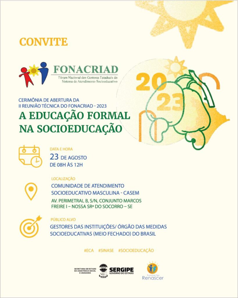 Para o presidente da Fundação Renascer, Samuel Barreto, o evento visa promover a cultura local e uma discussão voltada à socioeducação do Brasil, dando ênfase nos avanços do estado de Sergipe. “A Fundação é vinculada a assistência e ligada também a saúde e a educação, mas o futuro desses jovens passa acima de tudo pela educação do que qualquer outro aspecto, pois é através da educação e dos resultados desses jovens, que é possível enaltecer, em todo canto do Brasil e do mundo, que a socioeducação de Sergipe está baseada nas interfaces da pedagogia da presença”, pontuou o presidente.